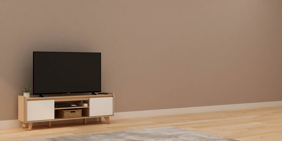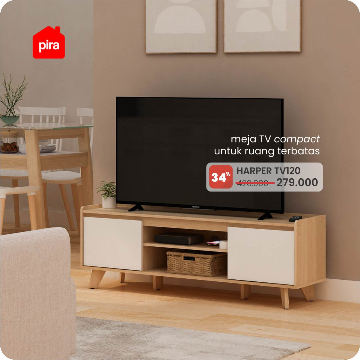 Untuk kamu yang punya ruang terbatas dan suka dengan konsep minimalis, bisa pilih HARPER TV120 untuk