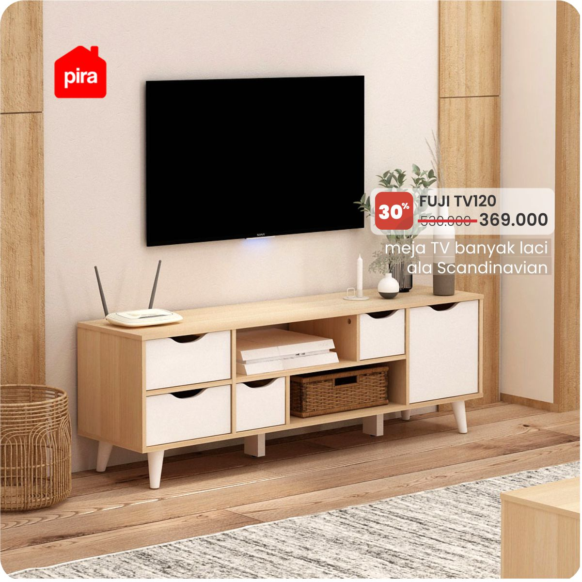 Meja TV dengan banyak laci yang cocok untuk rumah dengan konsep Scandinavian. Order yu Fuji TV120
