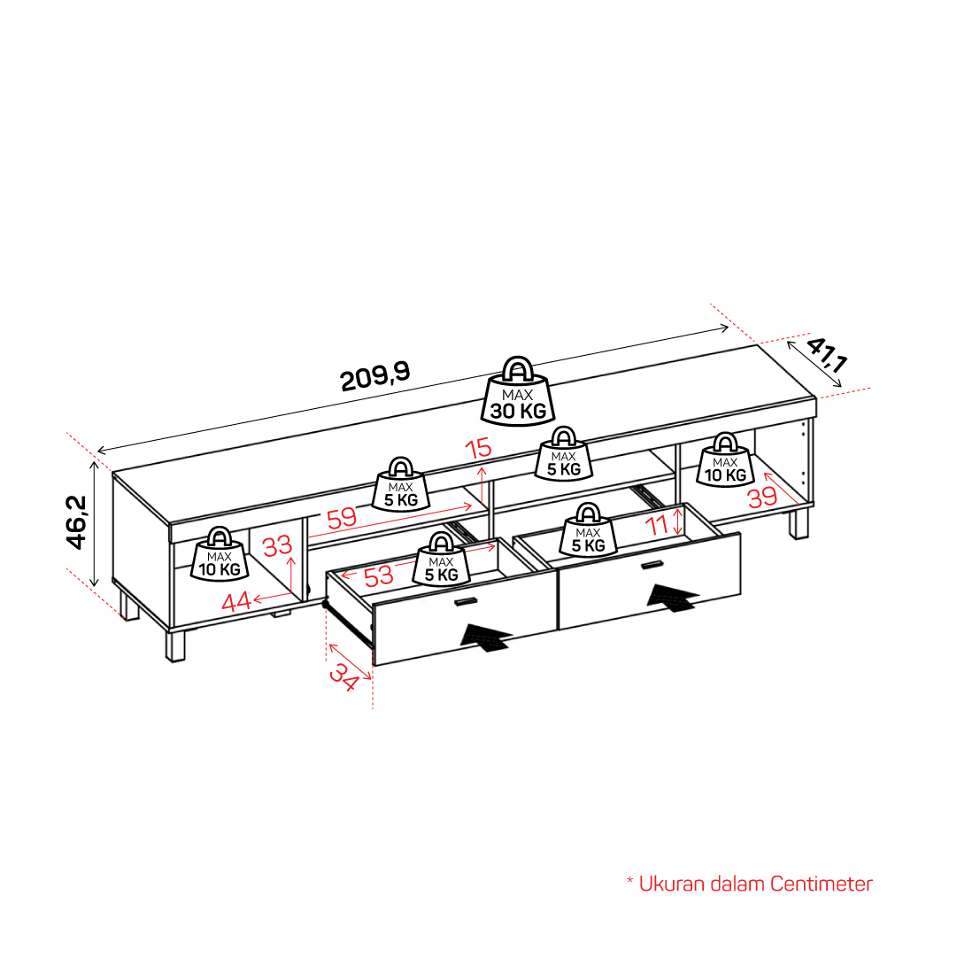 • Material Grade A hardwood particle board (kualitas terbaik) • Ketebalan part 15 mm • Laminasi paper sehingga lebih awet • Meja tv dengan banyak ruang penyimpanan • Top table luas dan kokoh, mampu menahan beban hingga 30 kg • Top table dapat digunakan sebagai meja TV, menyimpan pajangan, dan barang lainnya • Memiliki 2 rak tertutup pada bagian kanan dan kiri, cocok untuk menyimpan barang dengan maksimal berat 10 kg • Memiliki 2 laci luas dilengkapi rel besi, membantu buka tutup laci lebih smooth dan effortless • Dilengkapi 2 rak terbuka pada bagian atas, untuk menyimpan laptop, Set Top Box, atau PS • Dilengkapi lubang kabel untuk pengaturan perangkat elektronik • Handle rak dan laci simple dan minimalis • Desain kaki tinggi, mudah dijangkau saat membersihkan bagian bawah meja • Bagian kaki dilengkapi tatakan, melindungi dari kelembapan dan tidak merusak lantai • Dikirim dalam flatpack namun mudah dirakit, tersedia petunjuk + video tutorial di YouTube • Tersedia jasa perakitan di area JABODETABEK, Surabaya, Sidoarjo dan Gresik • Garansi 14 hari, syarat & ketentuan berlaku |