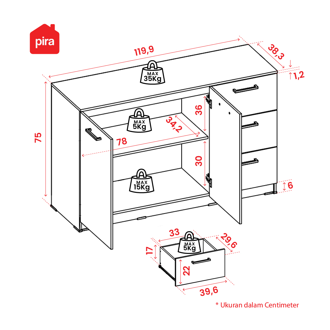 ✅ Bahan: Grade A hardwood particle board (kualitas terbaik). ✅ Tipe furnitur: Bufet dapur dengan 2 pintu dan 3 laci. ✅ Panjang, lebar, & tinggi: 119,8 cm x 38,3 cm x 75 cm ✅ rel laci berbahan besi ✅ handle berbahan plastik ✅ Laminasi: Paper. |