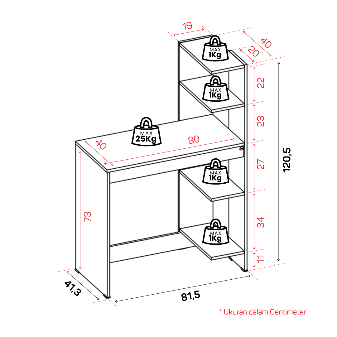 ✅ Bahan: Grade A hardwood particle board (kualitas terbaik) all PB15mm. ✅ Tipe furnitur: Meja kerja/belajar ✅ Panjang, lebar, & tinggi: 81,5 cm x 41,1 cm x 120,5 cm ✅ Laminasi: Paper. |