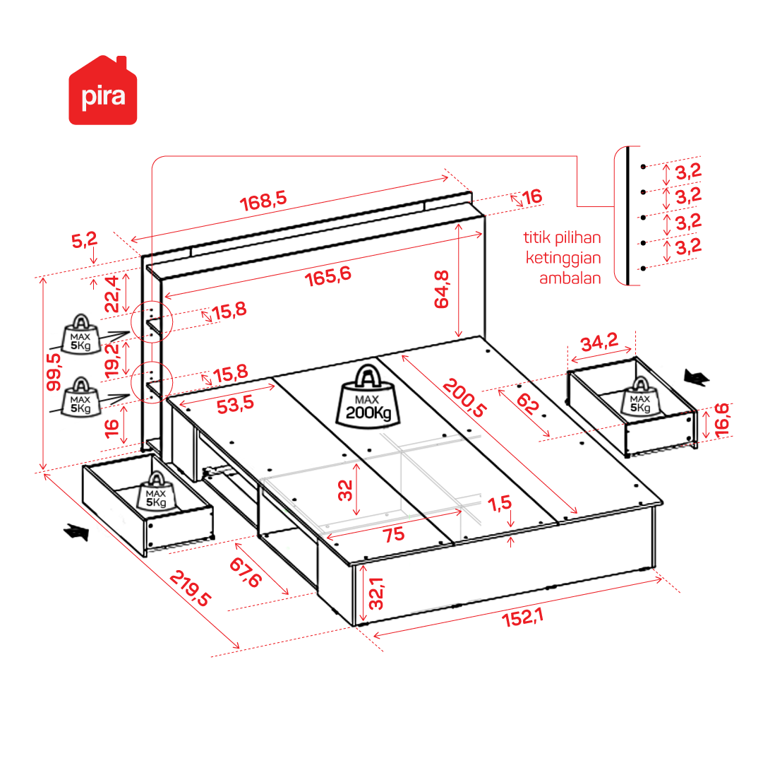 ✅ Bahan: Grade A hardwood particle board (kualitas terbaik). ✅ Tipe furnitur: Dipan/tempat tidur. ✅ Panjang, lebar, & tinggi: 168,5 cm x 219,5 cm x 99,5 cm ✅ Laminasi: Paper. |