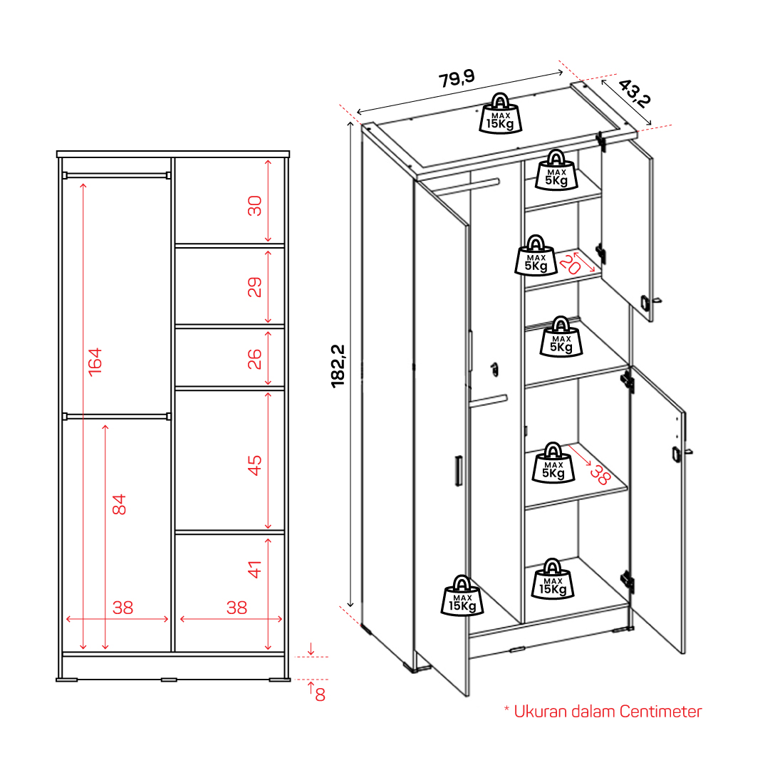 ✅ Bahan: Grade A hardwood particle board (kualitas terbaik). ✅ Ketebalan bagian atas (top) 12+12 mm, Part lainnya 12 mm. ✅ Tipe furnitur: Lemari pakaian. ✅ Panjang, lebar, & tinggi: 79,9 cm x 43,2 cm x 182,2 cm ✅ Dilengkapi dengan cermin. Kaca mirror tebal 2mm, dilengkapi penjepit kaca ✅ Pintu dilengkapi kunci ✅ 2 gantungan baju ✅ Handle pintu berbahan plastik ✅ Laminasi : Paper. |