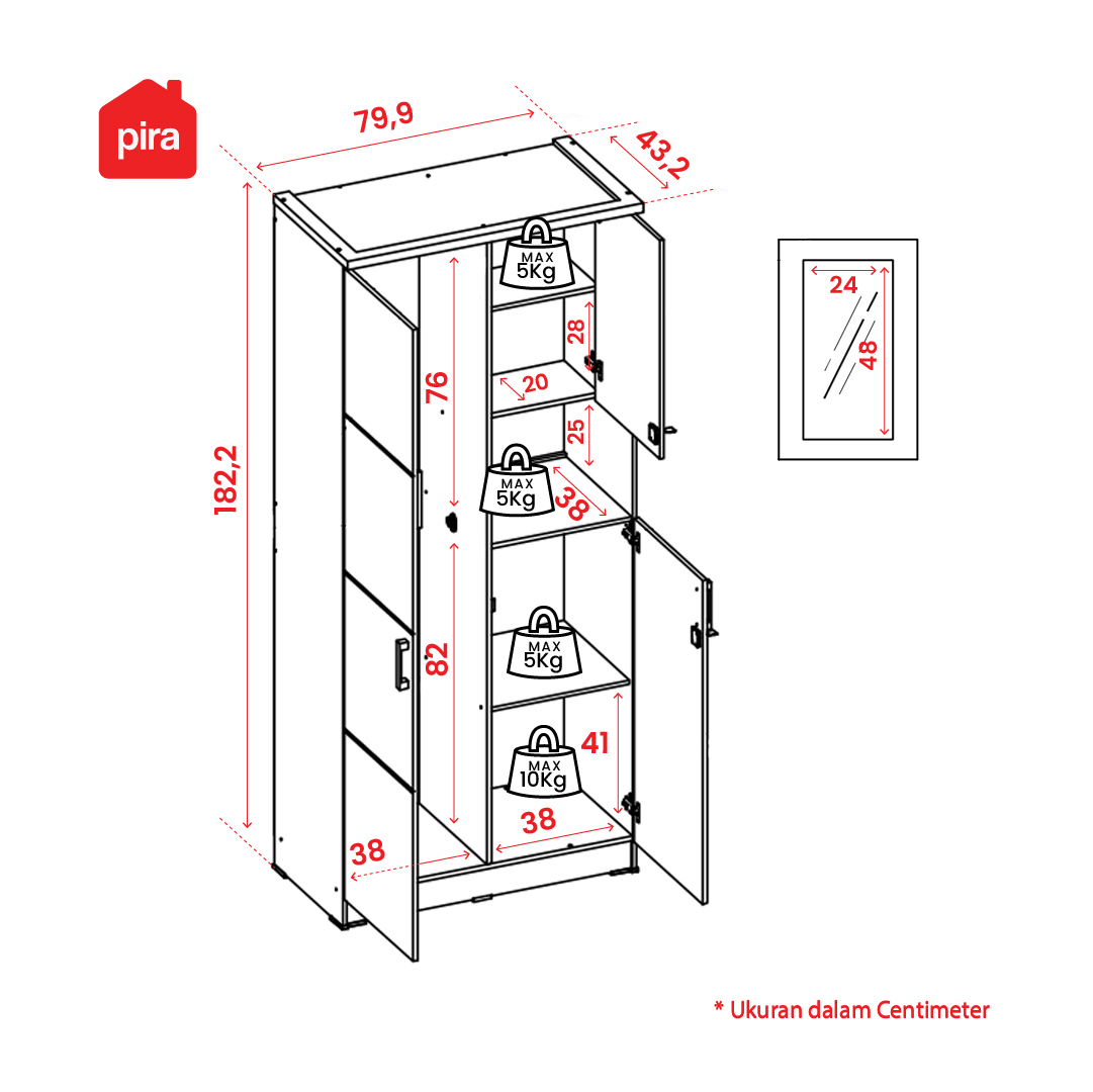 ✅ Bahan: Grade A hardwood particle board (kualitas terbaik). ✅ Tipe furnitur: Lemari pakaian. ✅ Panjang, lebar, & tinggi: 79,9 cm x 43 cm x 182 cm ✅ Ketebalan bagian atas (top) 12+12 mm, Part lainnya 12 mm. laminasi paper ✅ Pintu, depan laci, panel tengah & shelf PB 12mm laminasi paper warna White ✅ Dilengkapi dengan cermin. Kaca mirror tebal 2mm, dilengkapi penjepit kaca ✅ Pintu dilengkapi kunci ✅ 2 gantungan baju |
