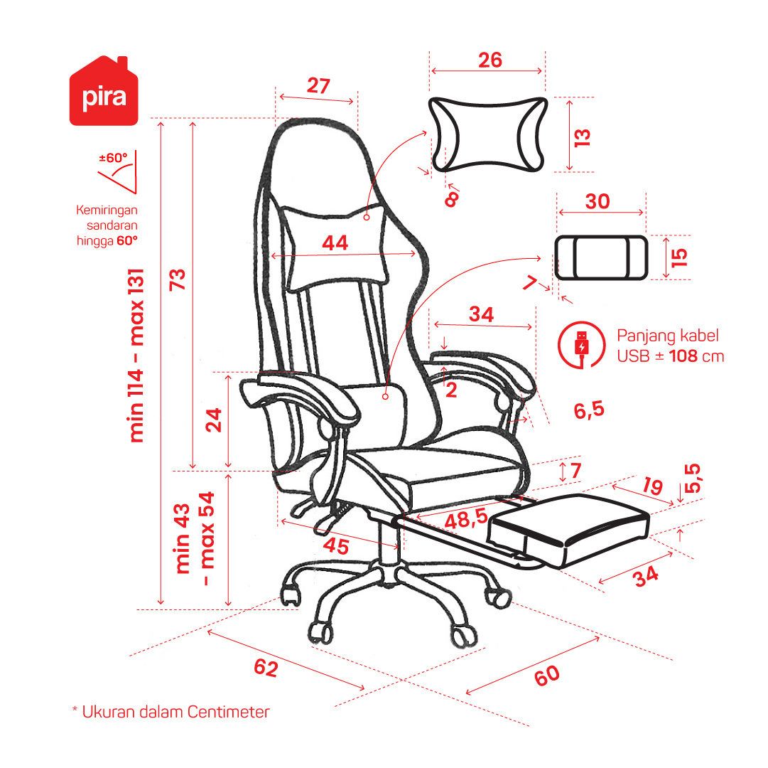 ✅ Material: Polyester (Red), Fabric (TURQUOISE) ✅ Tinggi kursi max: 131cm ✅ Tinggi sandaran dapat disesuaikan ✅ Ketinggian gaslift 10cm ✅ Fitur pijat (getar) di lumbar bantal ✅ Fitur manual footrest ✅ bantalan dapat dilepas pasang dan disesuaikan ✅ Panjang, lebar, & tinggi: 131 cm x 60 cm x 62 cm. |