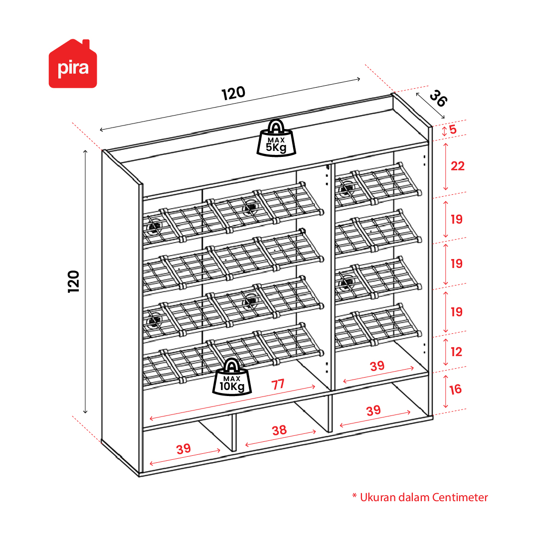 ✅ Bahan: Grade A hardwood particle board (kualitas terbaik) ketebalan 15 mm. ✅ Tipe furnitur: Rak sepatu. ✅ Muat hingga 36 pasang sepatu ✅ Laminasi: Paper. ✅ 120 cm x 36 cm x 120 cm |
