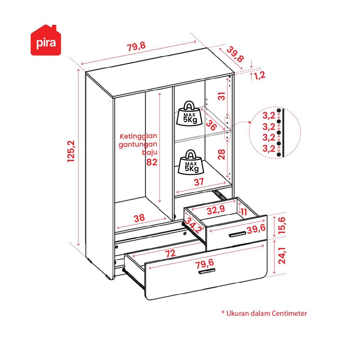• Material Grade A hardwood particle board (kualitas terbaik) • Ketebalan part 12 mm • Laminasi paper sehingga lebih awet • Lemari pakaian anak dengan penyimpanan yang luas • Bagian atas lemari dapat digunakan untuk menyimpan pajangan dan mainan anak • Dilengkapi area gantung, untuk menyimpan dress dan baju panjang anak lainnya • Terdapat 2 area rak yang luas, untuk menyimpan baju lipat anak • Rak dapat di adjust ketinggiannya sesuai dengan kebutuhan • Dilengkapi laci kecil untuk menyimpan kaos kaki, sapu tangan, dan aksesoris anak • Terdapat laci besar pada bagian bawah, cocok untuk menyimpan selimut dan sprei anak • Laci dilengkapi rel besi, memudahkan buka-tutup laci lebih smooth • Tersedia 3 varian handle yang dapat dipilih sesuai keinginan anak • WOODY BL80 memiliki desain handle minimalis untuk kesan yang rapi • WOODY BL80 CR memiliki desain handle bulat warna kuning, memberikan nuansa ceria sekaligus mudah digenggam • WOODY BL80 CL memiliki desain handle bentuk awan, untuk kesan yang lucu dan disukai anak-anak • Dilengkapi tatakan untuk mencegah goresan pada lantai • Dikirim dalam flatpack namun mudah dirakit, tersedia petunjuk + video tutorial di YouTube • Tersedia jasa perakitan di area JABODETABEK, Surabaya, Sidoarjo dan Gresik • Garansi 14 hari, syarat & ketentuan berlaku |