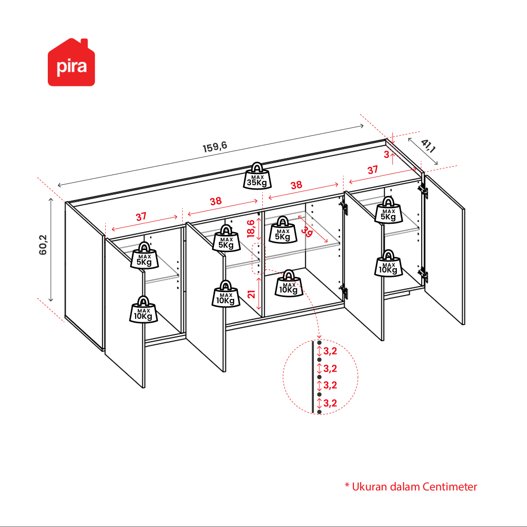 • Material Grade A hardwood particle board (kualitas terbaik) • Ketebalan part 12 mm • Laminasi paper sehingga anti jamur dan lebih awet • Meja TV multifungsi dengan banyak ruang penyimpanan • Top table white marble dengan laminasi PVC, tahan air dan mudah dibersihkan • Top table kokoh, mampu menahan beban hingga 35 kg • Desain top table berpagar, menjaga barang tidak mudah terjatuh • Cocok digunakan untuk TV hingga ukuran 50 inci • Dilengkapi rak 4 pintu, membantu menyimpan barang lebih rapih dan bebas dari debu • Rak dapat di adjust ketinggiannya sesuai dengan kebutuhan • Dilengkapi lubang kabel, mengatur tampilan kabel agar tetap terlihat rapi • Desain pintu rak handless, memberi kesan modern dan rapi • Dilengkapi tatakan, mencegah goresan pada lantai • Dikirim dalam flatpack namun mudah dirakit, tersedia petunjuk + video tutorial di YouTube • Tersedia jasa perakitan di area JABODETABEK, Surabaya, Sidoarjo dan Gresik • Garansi 14 hari, syarat & ketentuan berlaku |
