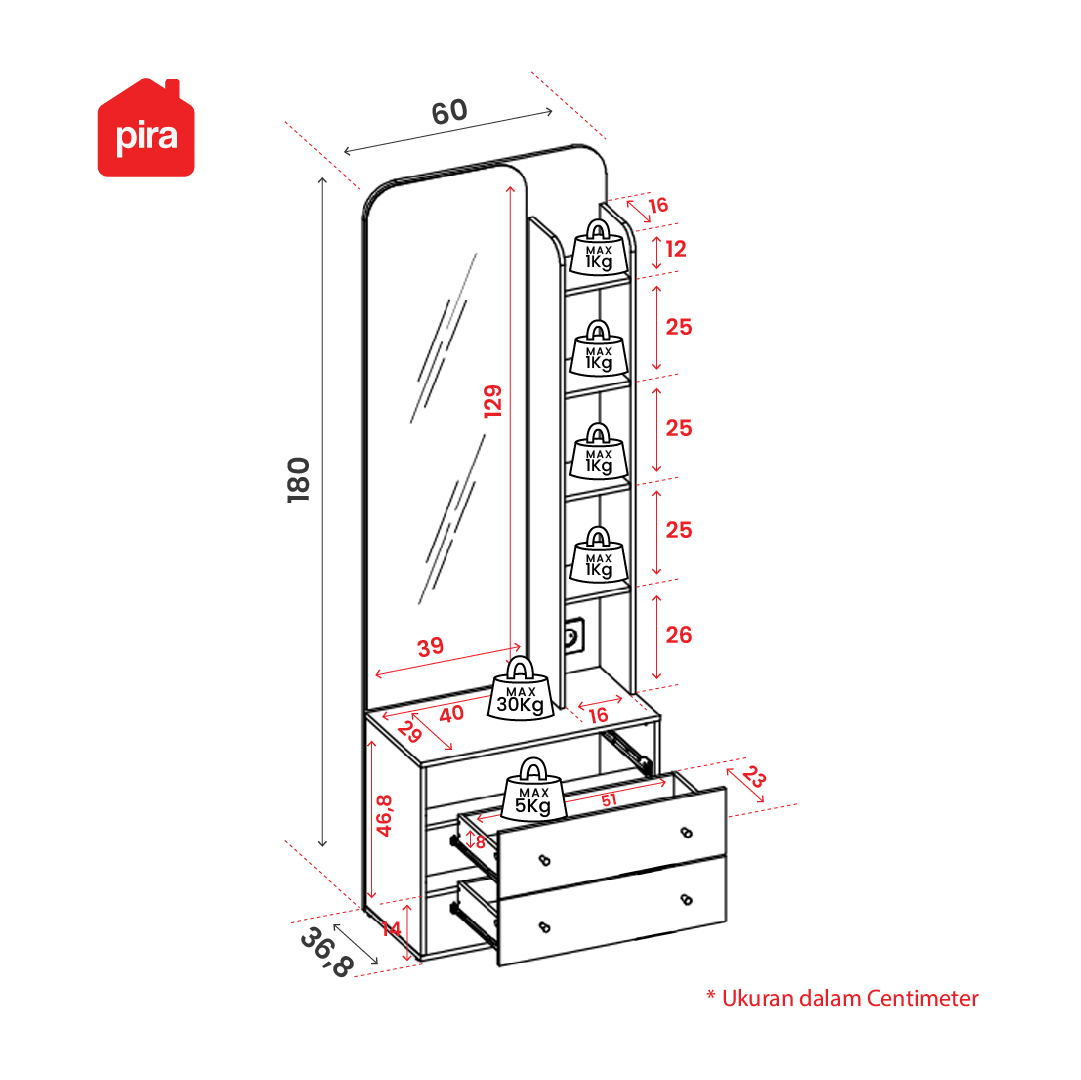 • Material Grade A hardwood particle board (kualitas terbaik) • Ketebalan part 12 mm • Laminasi paper sehingga lebih awet • Meja rias dilengkapi 2 laci penyimpanan dan rak terbuka • Pilihan cermin panjang (DS60) dan cermin geser (DS80 SL) tebal 2 mm, memudahkan cek OOTD dan penampilan • Area atas untuk simpan dekorasi, diffuser, dan koleksi barang lainnya (DS80 SL) • Area penyimpanan terbuka mulai dari 3–5 rak susun, memudahkan akses dan penataan barang • Ketinggian rak dapat diatur sesuai kebutuhan (DS80 SL) • Dilengkapi colokan listrik untuk penggunaan alat elektronik • Dilengkapi 2 laci untuk menyimpan banyak barang, seperti hair dryer, catokan, dan alat make-up • Handle plastik minimalis (DS60), lebih rapi dan nyaman • Dilengkapi rel untuk memudahkan buka-tutup laci • Area bawah dilengkapi penyimpanan terbuka untuk simpan tas • Dilengkapi tatakan kaki untuk mencegah goresan pada lantai • Dikirim dalam flatpack namun mudah dirakit, tersedia petunjuk + video tutorial di YouTube • Tersedia jasa perakitan di area JABODETABEK, Surabaya, Sidoarjo dan Gresik • Garansi 14 hari, syarat & ketentuan berlaku |