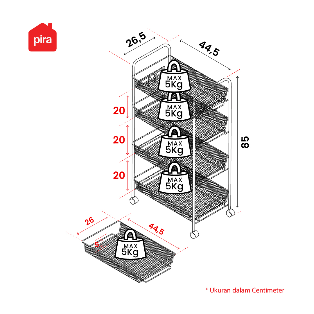PIRA - GUMI MKT4 RAK TROLI / RAK SERBAGUNA / RAK BESI 3/ 4/ 5 SUSUN DENGAN RODA