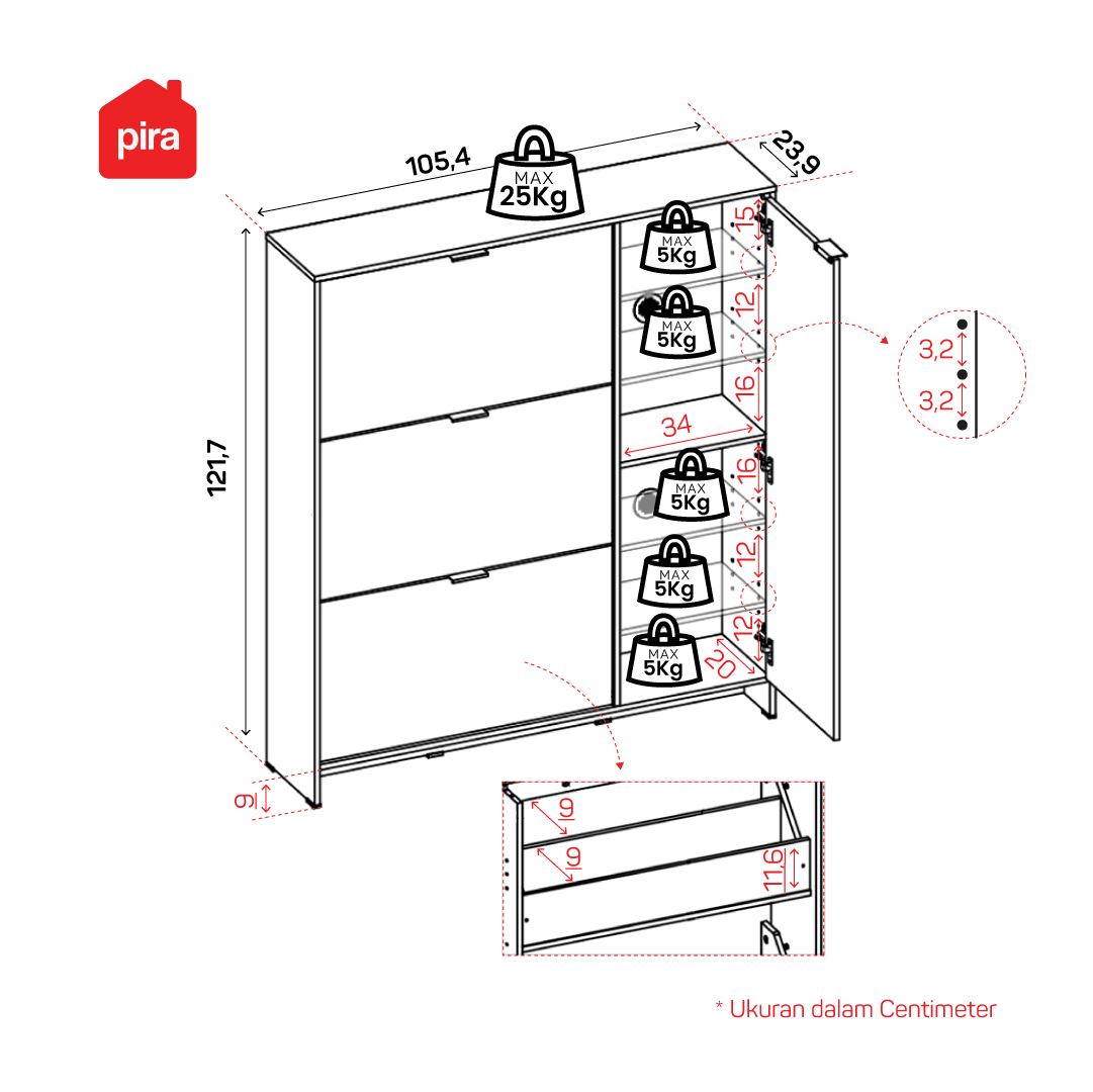 ✅ Bahan: Grade A hardwood particle board (kualitas terbaik) ketebalan 12 mm. ✅ Tipe furnitur: Rak sepatu. ✅ Panjang, lebar, & tinggi: 105,4 cm x 23,9 cm x 121,7 cm ✅ Dilengkapi handle ✅ Laminasi: Paper. ✅ Muat 24 pasang sepatu |