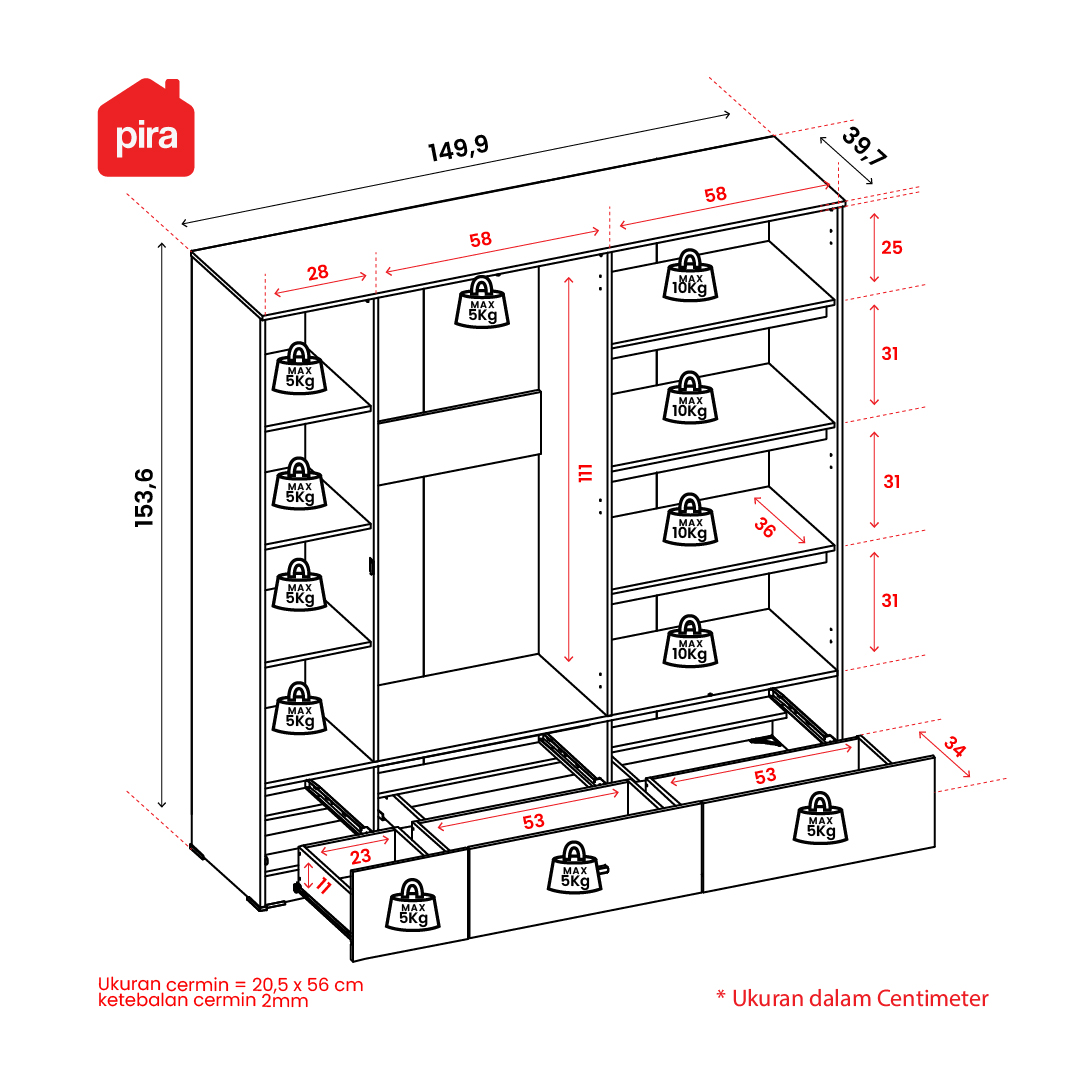 PIRA METROPOLIS OX - ARUNA BL5P 3DR LEMARI PAKAIAN 5 PINTU / LEMARI BAJU DENGAN LACI