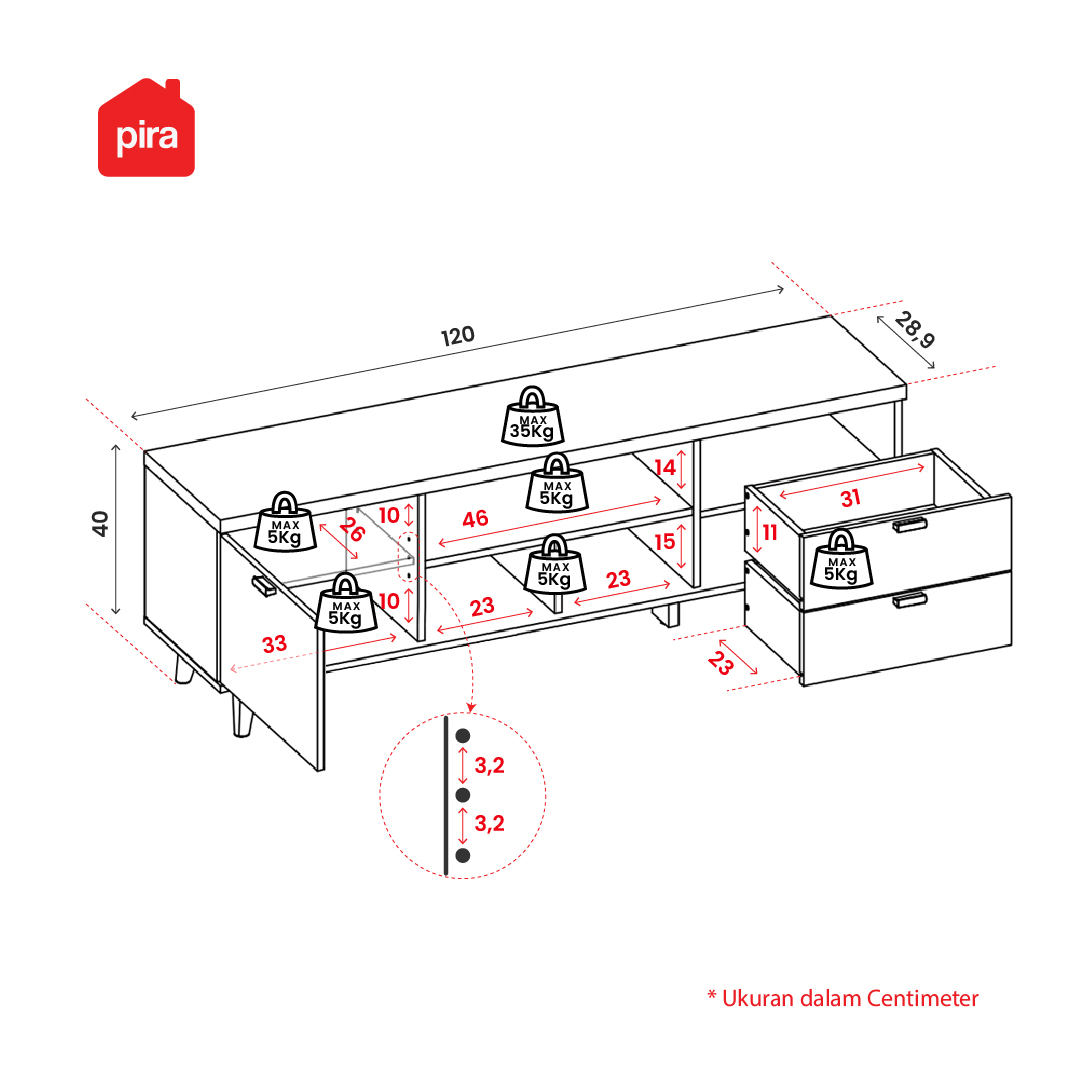✅ Bahan: Grade A hardwood particle board (kualitas terbaik) ketebalan 12 mm. ✅ Tipe furnitur: Meja TV/rak TV. ✅ Dilengkapi dengan dua laci dan 1 pintu ✅ Kedua laci dapat ditarik sampai lepas; memudahkan untuk dibersihkan dan mengambil barang ✅ bagian tengah dapat ditaruh berbagai macam barang karena tidak dibatasi dengan deck belakang ✅ Bagian deck belakang dilengkapi dengan lubang kabel ✅ Panjang, lebar, & tinggi: 120 cm x 28,9 cm x 40 cm ✅ Laminasi: Paper. |