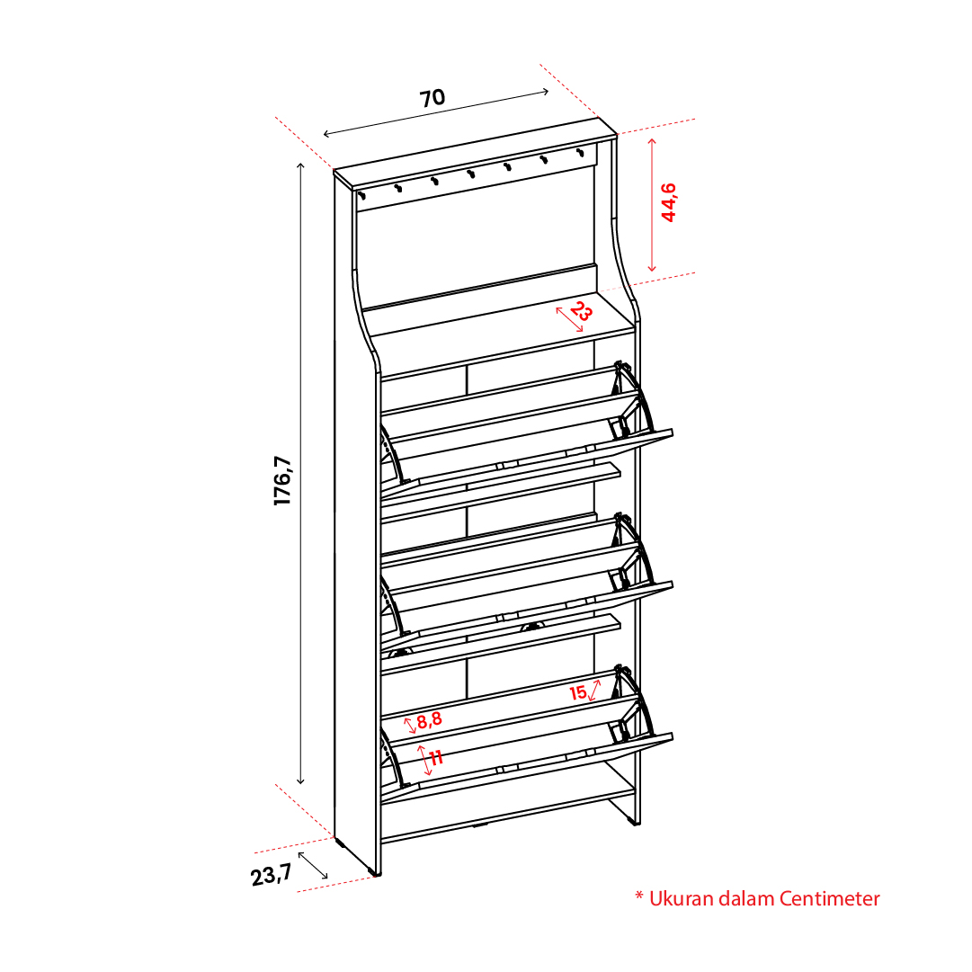 ✅ Material Grade A hardwood particle board (kualitas terbaik) ✅ Ketebalan part 12 mm ✅ Laminasi paper sehingga lebih awet ✅ Rak sepatu dengan pintu flip 2 layer dapat menyimpan lebih banyak sepatu ✅ Style japandi hand-less membuat rak lebih elegan dan minimalis ✅ Muat hingga 18 pasang sepatu berbagai model ✅ Pada bagian atas rak, dilengkapi 6 hook untuk meletakkan topi, payung, dan kunci ✅ Dilengkapi lubang sirkulasi udara menjaga sepatu tetap segar dan tidak pengap ✅ Braket rak terbuat dari plastik, ringan dan tahan lama ✅ Bagian bawah rak lebih luas, mudah dibersihkan dan dapat berfungsi menyimpan sandal |