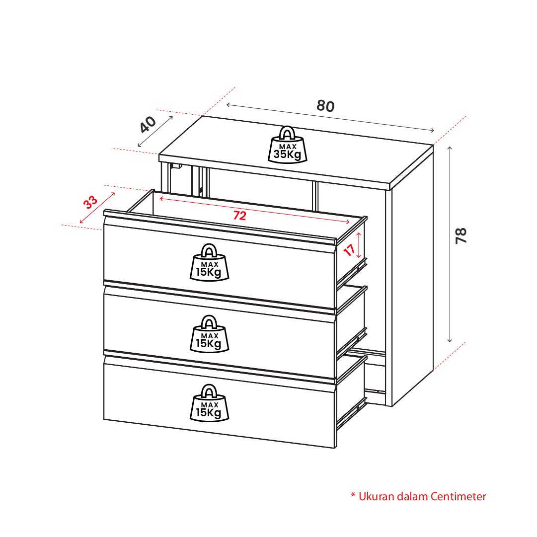 • Material Metal, kuat, durable dan tahan lama • Finishing epoxy powder coating tahan lama • Desain minimalis dengan 3 laci fungsional • Cocok digunakan untuk ruang tamu, kamar, dan ruang keluarga • Kapasitas laci yang luas untuk menyimpan berbagai barang kebutuhan, seperti buku, mainan anak, dan pakaian lipat • Top table motif kayu meningkatkan kesan hangat dan estetik pada ruang • Handle ergonomis, nyaman saat buka-tutup laci • Dilengkapi adjuster kaki, sehingga tetap stabil di permukaan lantai tidak rata • Dikirim dalam flatpack namun mudah dirakit, tersedia petunjuk + video tutorial di YouTube • Tersedia jasa perakitan di area JABODETABEK, Surabaya, Sidoarjo dan Gresik • Garansi 14 hari, syarat & ketentuan berlaku |