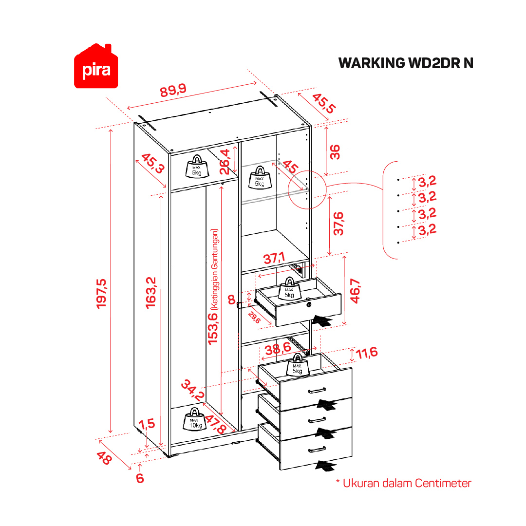 ✅ Bahan: Grade A hardwood particle board (kualitas terbaik). ✅ Ketebalan part 15 mm ✅ Tipe furnitur: Lemari pakaian. ✅ Panjang, lebar, & tinggi: 93 cm x 50 cm x 197,8 cm ✅ Laminasi: Paper. ✅ Dilengkapi dengan cermin. |